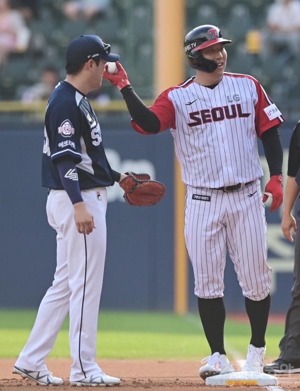 21일 서울 잠실야구장에서 열린 ‘2022 신한은행 SOL KBO리그’ LG 트윈스와 두산 베어스의 경기에서 1회초 1사 2루 LG 김현수가 1타점 우전 적시타로 8년 연속 200루타를 달성해 기념구를 챙기고 있다.