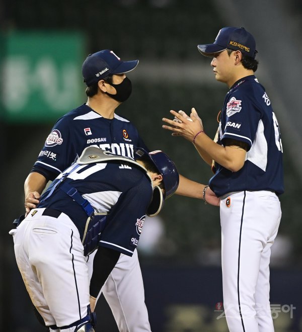 21일 서울 잠실야구장에서 열린 ‘2022 신한은행 SOL KBO리그’ LG 트윈스와 두산 베어스의 경기에서 8회말 1사 1, 2루 LG의 강습 타구에 맞은 후 두산 정철원이 코치와 이야기를 하고 있다.