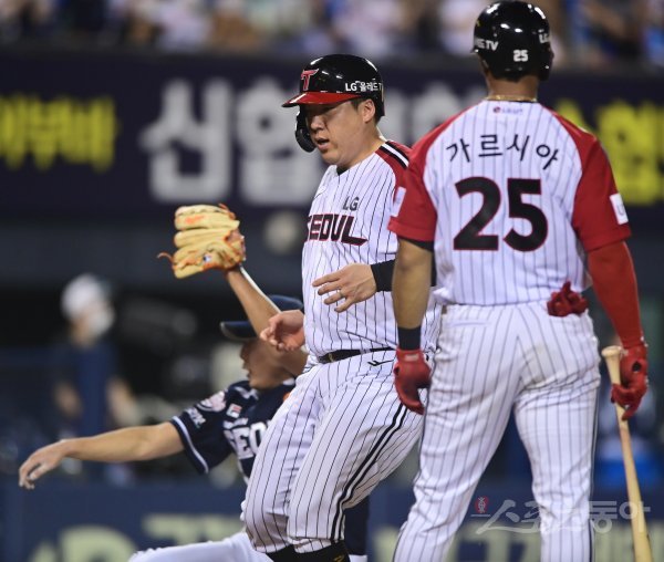 21일 서울 잠실야구장에서 열린 ‘2022 신한은행 SOL KBO리그’ LG 트윈스와 두산 베어스의 경기에서 8회말 1사 만루 상황에서 LG 3루주자 김현수가 두산 정철원의 폭투를 틈타 홈으로 파고들었지만 투수에게 태그 아웃되고 있다.