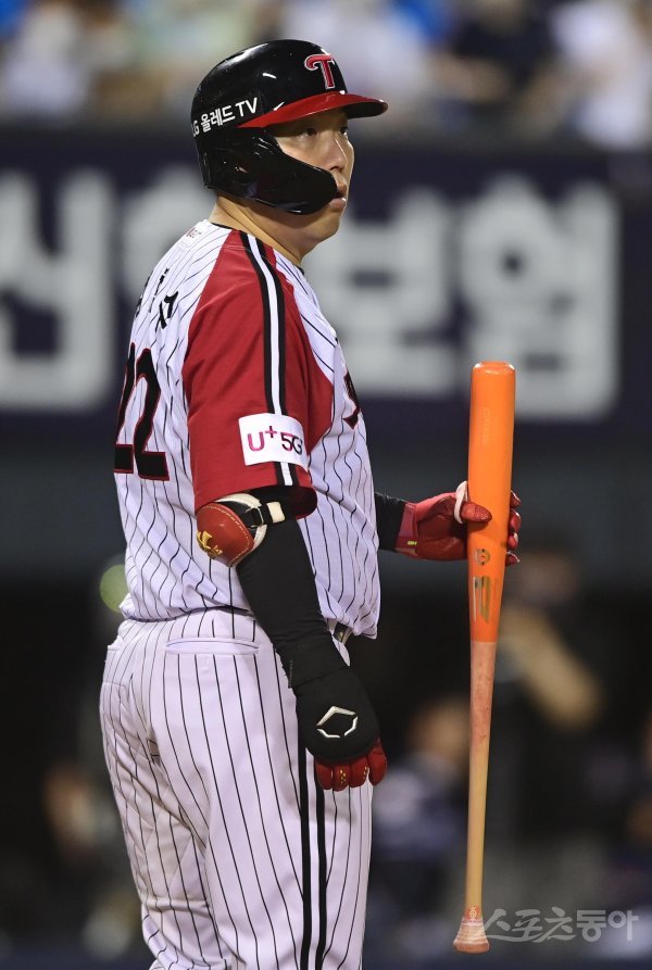 21일 서울 잠실야구장에서 열린 ‘2022 신한은행 SOL KBO리그’ LG 트윈스와 두산 베어스의 경기에서 8회말 무사 두산 포수의 타임 요청에도 투구가 진행되자 LG 김현수가 투수를 바라보고 있다.