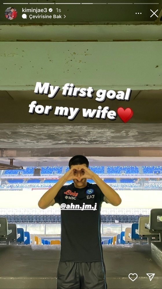 경기 후 김민재는 인스타그램 스토리에 손으로 하트를 만든 포즈로 촬영한 사진을 게재하면서 “첫 골은 아내를 위해(My first goal for my wife♥)”라는 글을 올려 아내에 대한 애정을 드러냈다.