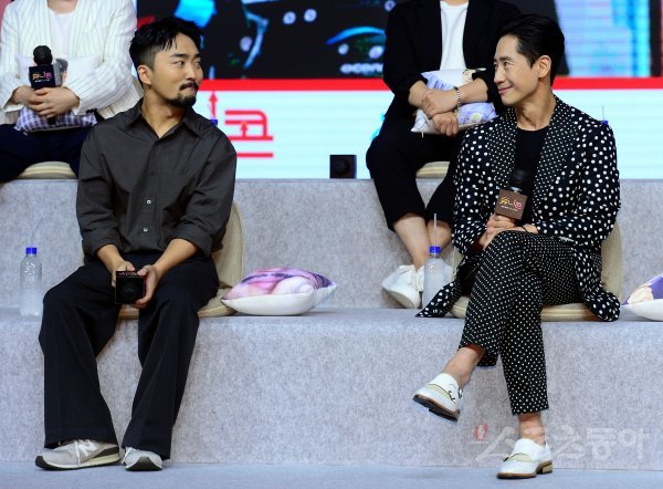 22일 오전 서울 여의도 콘래드호텔에서 열린 쿠팡플레이 시트콤 ‘유니콘’ 제작발표회에 참석한 유병재와 신하균이 눈빛을 교환하고 있다.웹드라마 ‘유니콘’은 은은하게 돌아있는 맥콤의 CEO 스티브와 크루들의 대혼돈 K-스타트업 분투기를 담고 있다.