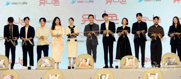 22일 오전 서울 여의도 콘래드호텔에서 열린 쿠팡플레이 시트콤 ‘유니콘’ 제작발표회에 참석한 배우들이 테이프 컷팅을 하고 있다.웹드라마 ‘유니콘’은 은은하게 돌아있는 맥콤의 CEO 스티브와 크루들의 대혼돈 K-스타트업 분투기를 담고 있다.