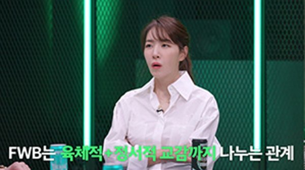자유로운 연애가 늘어난만큼 내 애인이 과거 ‘FWB’나 관계만 갖는 파트너 경험이 있다면 어떨 것 같으냐는 이야기도 나왔다. MC들은 “날 만나기 전이면 상관 없다”라고 과거에 연연하지 말자고 하는 한편, 김이나와 비비는 애인의 과거에 자극을 받기도 한다고 공감하기도 했다.