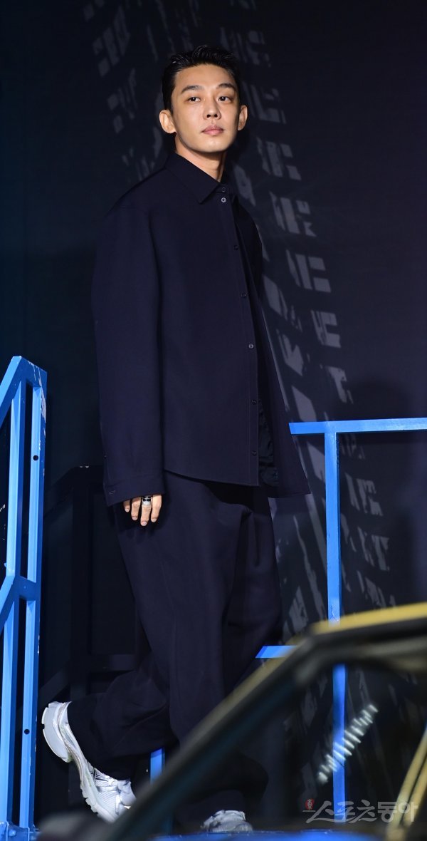 배우 유아인이 23일 서울 강남구 삼성동 그랜드인터컨티넨탈 서울 파르나스에서 열린 넷플릭스 시리즈 ‘서울대작전’ 제작보고회 무대에 입장하고 있다.