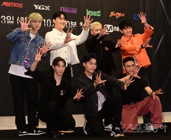 댄서 크루 저스트절크 영제이, 제이호, 에스원, 하울, 헐크, 예준, 민서가 23일 서울 마포구 상암동 스탠포드호텔에서 열린 Mnet ‘스트릿 맨 파이터’ 제작발표회에서 포즈를 취하고 있다.
