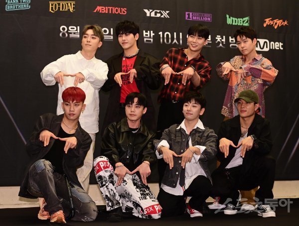 댄서 크루 엠비셔스 오천, 우태, 이호원, 노태현, 김평야, 진우, 타잔, 김정우가 23일 서울 마포구 상암동 스탠포드호텔에서 열린 Mnet ‘스트릿 맨 파이터’ 제작발표회에서 포즈를 취하고 있다.