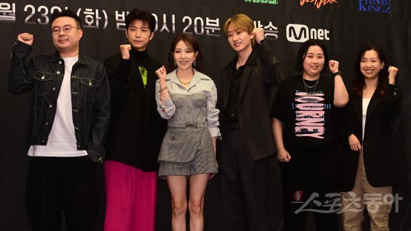 권영찬 CP, 2PM 장우영, 보아, 슈퍼주니어 은혁, 최정남 PD, 김나연 PD가 23일 서울 마포구 상암동 스탠포드호텔에서 열린 Mnet ‘스트릿 맨 파이터’ 제작발표회에서 포즈를 취하고 있다.
