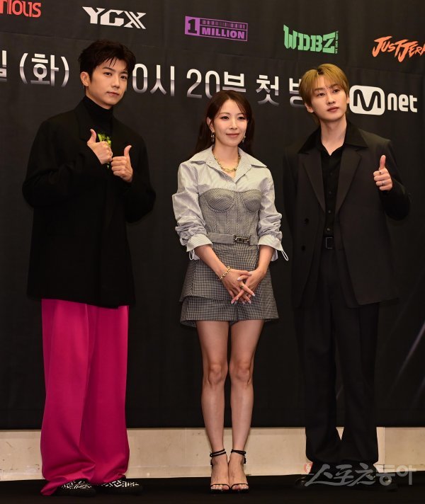 2PM 장우영, 보아, 슈퍼주니어 은혁이 23일 서울 마포구 상암동 스탠포드호텔에서 열린 Mnet ‘스트릿 맨 파이터’ 제작발표회에서 포즈를 취하고 있다.