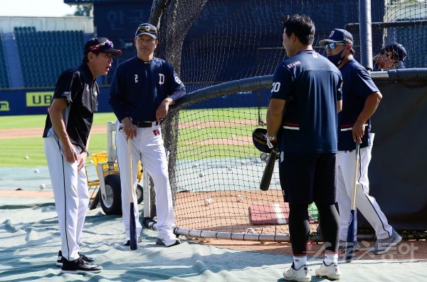 23일 서울 잠실야구장에서 ‘2022 신한은행 SOL KBO리그’ 두산 베어스와 kt 위즈의 경기가 열린다. 경기 전 kt 이강철 감독이 두산 강석천, 이정훈 코치와 안승한을 만나 이야기를 나누고 있다.