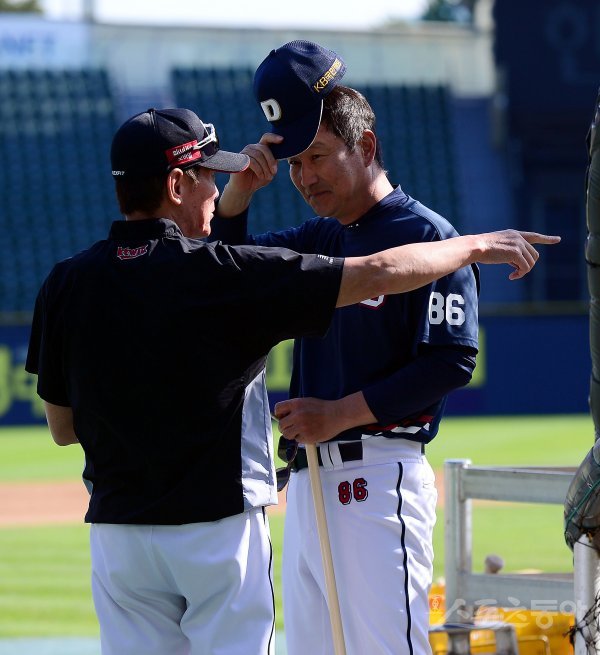23일 서울 잠실야구장에서 ‘2022 신한은행 SOL KBO리그’ 두산 베어스와 kt 위즈의 경기가 열린다. 경기 전 kt 이강철 감독이 두산 강석천 코치와 이야기를 나누고 있다.