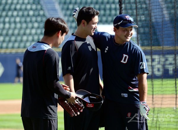 23일 서울 잠실야구장에서 ‘2022 신한은행 SOL KBO리그’ 두산 베어스와 kt 위즈의 경기가 열린다. 경기 전 두산 안승한이 kt 옛 동료들과 만나 인사를 나누고 있다.