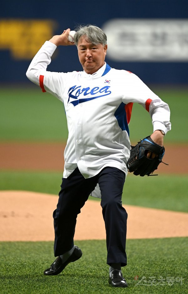23일 서울 고척스카이돔에서 ‘2022 신한은행 MY CAR KBO리그’ KIA 타이거즈와 키움 히어로즈 경기가 열렸다. ‘야구의 날’을 맞아 공로패를 받은 김경문 전 감독이 시구를 하고 있다.