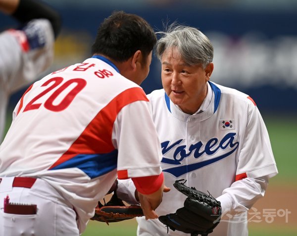 23일 서울 고척스카이돔에서 ‘2022 신한은행 MY CAR KBO리그’ KIA 타이거즈와 키움 히어로즈 경기가 열렸다. ‘야구의 날’을 맞아 공로패를 받은 김경문 전 감독이 시구를 마치고 시포를 한 진갑용 코치와 악수를 하고 있다.