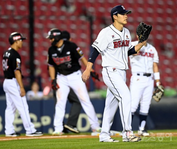 23일 서울 잠실야구장에서 ‘2022 신한은행 SOL KBO리그’ 두산 베어스와 kt 위즈의 경기가 열렸다. 5회초 1사 1루에서 두산 선발 최원준이 1루 견제실책을 범한 후 아쉬워하고 있다.
