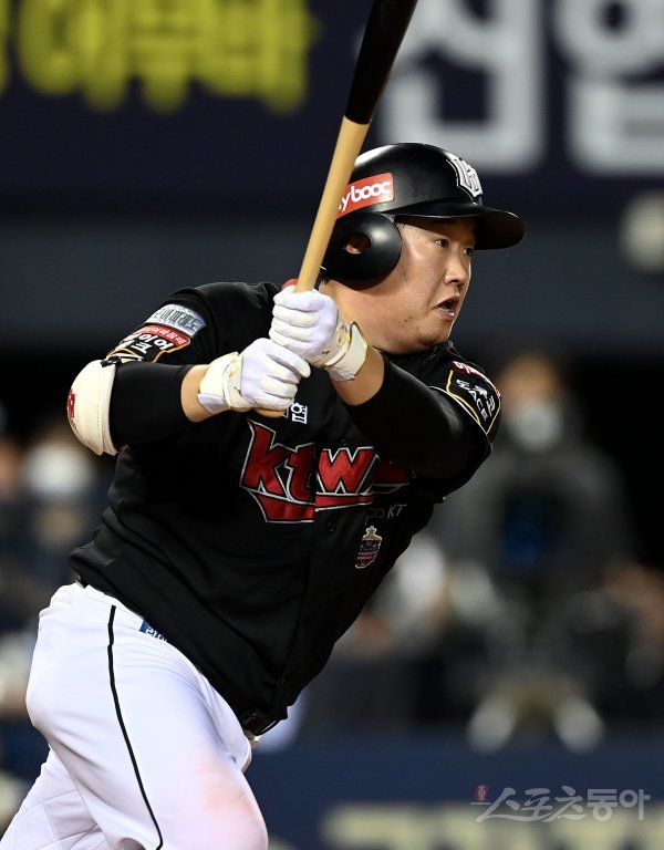 23일 서울 잠실야구장에서 ‘2022 신한은행 SOL KBO리그’ 두산 베어스와 kt 위즈의 경기가 열렸다. 5회초 2사 3루에서 kt 김준태가 1타점 동점 적시타를 날리고 있다.