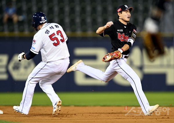 23일 서울 잠실야구장에서 ‘2022 신한은행 SOL KBO리그’ 두산 베어스와 kt 위즈의 경기가 열렸다. 5회말 무사 1루에서 삼진 아웃 때 kt 심우준이 두산 양석환의 2루 도루를 저지하기 위해 수비를 펼치고 있다.