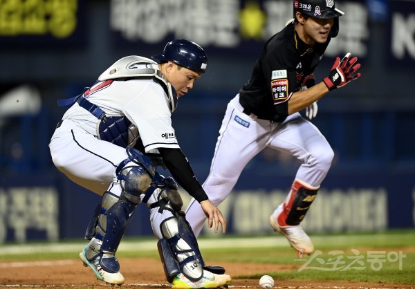 23일 서울 잠실야구장에서 ‘2022 신한은행 SOL KBO리그’ 두산 베어스와 kt 위즈의 경기가 열렸다. 7회초 2사 1루에서 kt 심우준의 스트라이크 낫아웃 때 두산 박세혁이 수비를 펼치고 있다.