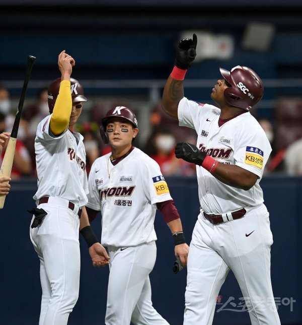23일 서울 고척스카이돔에서 ‘2022 신한은행 MY CAR KBO리그’ KIA 타이거즈와 키움 히어로즈 경기가 열렸다. 8회말 2사 2,3루 키움 푸이그가 좌월 스리런 홈런을 날리고 그라운드를 돌아 홈인해 이정후와 기뻐하고 있다.
