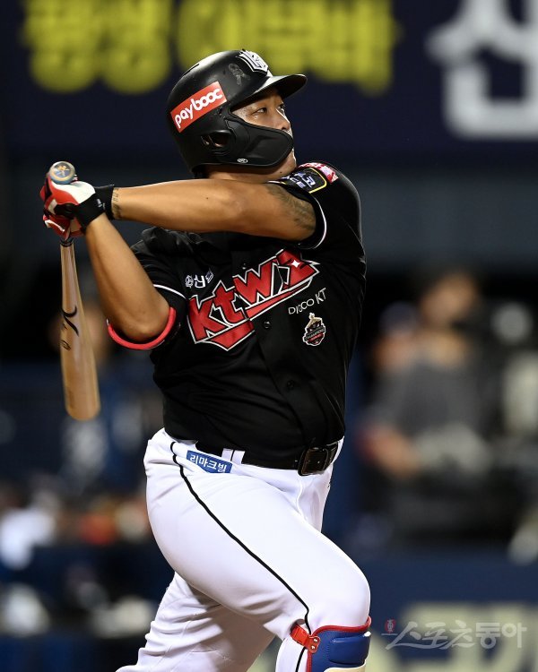 23일 서울 잠실야구장에서 ‘2022 신한은행 SOL KBO리그’ 두산 베어스와 kt 위즈의 경기가 열렸다. 연장 11회초 무사 1루에서 kt 강백호가 1타점 2루타를 날리고 있다.