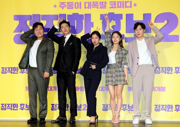 24일 오전 서울 롯데시네마 건대입구에서 열린 영화 ’정직한 후보2’의 제작보고회에 참석한 윤경호, 김무열, 라미란, 박진주, 서현우가 포즈를 취하고 있다.
