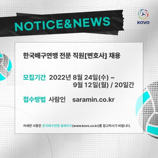 KOVO는 24일 V-리그 운영과 배구 발전에 함께할 전문 변호사를 채용한다고 전했다.