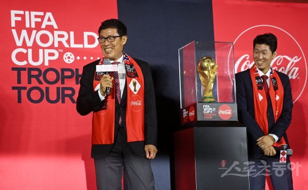 24일 ‘FIFA 월드컵 트로피 투어’의 일환으로 서울 여의도 더현대 서울에서 FIFA 월드컵 트로피 공개행사가 진행됐다. 차범근 전 감독과 박지성이 질문에 대답하고 있다.
