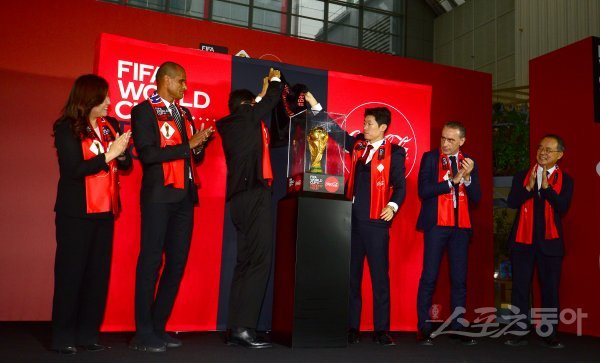 24일 ‘FIFA 월드컵 트로피 투어’의 일환으로 서울 여의도 더현대 서울에서 FIFA 월드컵 트로피 공개행사가 진행됐다. 차범근 전 감독과 박지성이 트로피를 공개하고 있다.