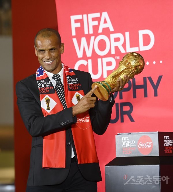 24일 ‘FIFA 월드컵 트로피 투어’의 일환으로 서울 여의도 더현대 서울에서 FIFA 월드컵 트로피 공개행사가 진행됐다. 전 브라질 축구 국가대표 히바우두가 오리지널 FIFA 월드컵 트로피 밑에 브라질 글씨를 가리키고 있다.