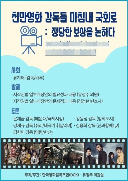 윤제균, 김한민, 김용화 등 한국 대표 ‘1000만 감독’들이 국회에서 열리는 저작권법 개정안 토론회에 참석해 케이(K)콘텐츠 창작자의 정당한 권리 찾기에 나선다. 유정주 더불어민주당 의원실과 한국영화감독조합(감독조합)이 공동으로 주최·주관하는 이번 토론회는 31일 오전 국회 의원회관에서 열린다. 배우 유지태가 사회자로 나선다. 24일 감독조합 측은 “저작권법을 개정해 영상창작자의 공정보상권을 법제화하는 걸 중점적으로 다룰 계획”이라며 “영상창작자들의 안전망 붕괴를 묵과한다면 케이콘텐츠의 화양연화도 10년을 넘기기 힘들다”고 밝혔다.