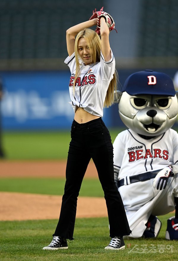 24일 서울 잠실야구장에서 ‘2022 신한은행 SOL KBO리그’ 두산 베어스와 kt 위즈의 경기가 열렸다. 경기 전 소녀시대 효연이 승리기원 시구를 던지고 있다.