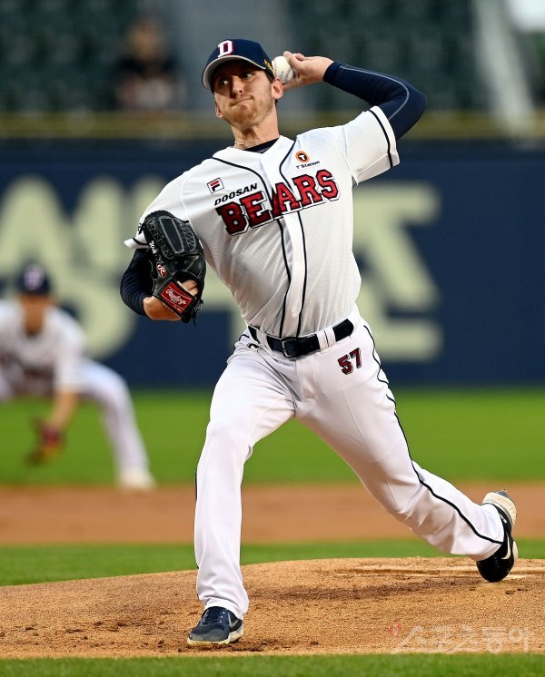 24일 서울 잠실야구장에서 ‘2022 신한은행 SOL KBO리그’ 두산 베어스와 kt 위즈의 경기가 열렸다. 두산 선발투수 브랜든이 힘차게 볼을 던지고 있다.