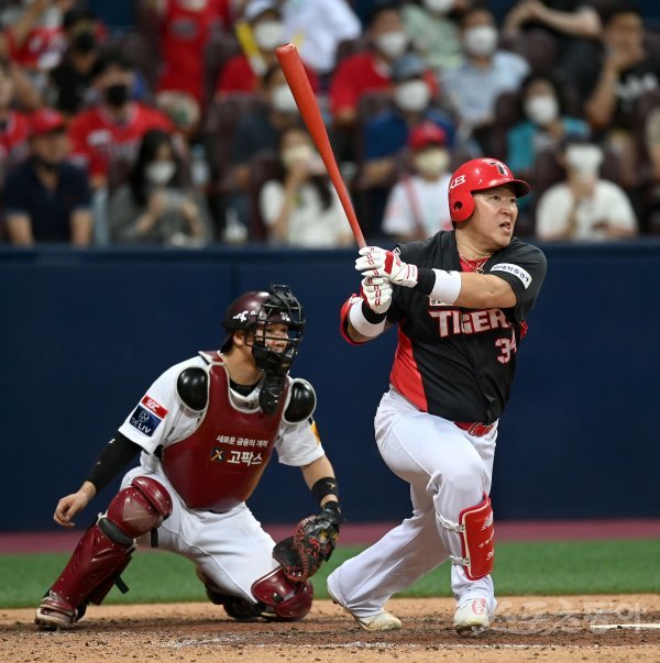 24일 서울 고척스카이돔에서 ‘2022 신한은행 MY CAR KBO리그’ KIA 타이거즈와 키움 히어로즈 경기가 열렸다. 5회초 1사 만루 KIA 최형우가 다시 앞서간느 2타점 적시타를 치고 있다.