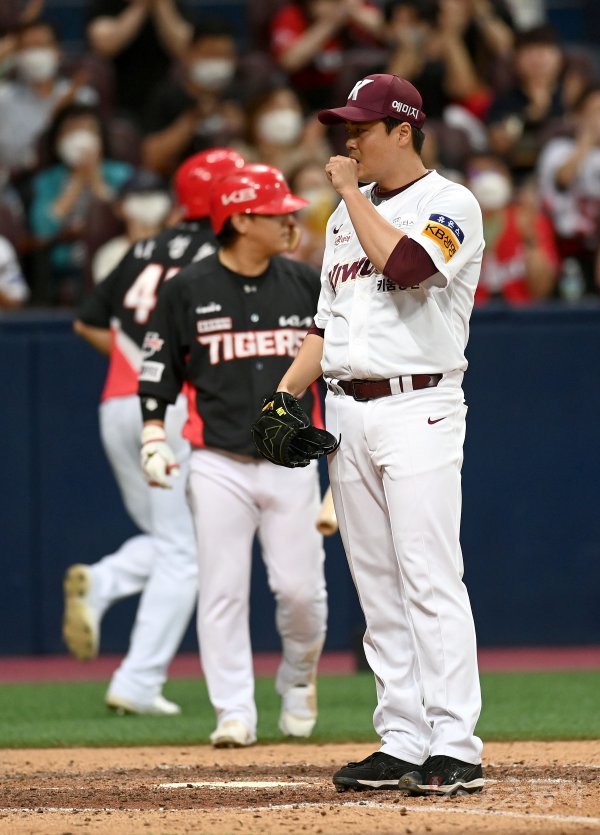 24일 서울 고척스카이돔에서 ‘2022 신한은행 MY CAR KBO리그’ KIA 타이거즈와 키움 히어로즈 경기가 열렸다. 5회초 2사 2,3루 키움 이영준이 폭투로 실점한 후 아쉬워하고 있다.