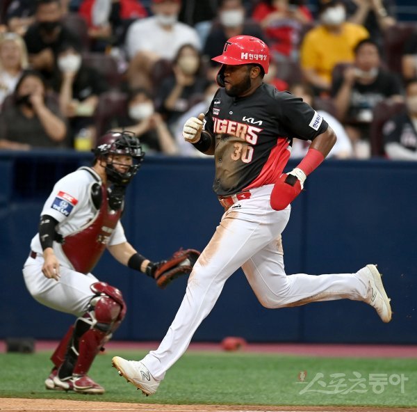 24일 서울 고척스카이돔에서 ‘2022 신한은행 MY CAR KBO리그’ KIA 타이거즈와 키움 히어로즈 경기가 열렸다. 4회초 1사 3루 KIA 외야 뜬공 때 3루주자 소크라테스가 태그업 시도해 홈에서 세이프 되고 있다.
