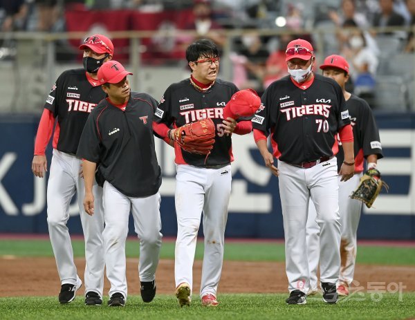 24일 서울 고척스카이돔에서 ‘2022 신한은행 MY CAR KBO리그’ KIA 타이거즈와 키움 히어로즈 경기가 열렸다. 2회말 1사 키움 김혜성 1루수 앞 땅볼 때 KIA 선발 양현종이 베이스커버에 들어가다 황대인과 충돌한 후 고통스러워하고 있다.