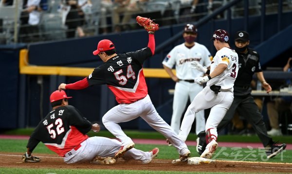 24일 서울 고척스카이돔에서 ‘2022 신한은행 MY CAR KBO리그’ KIA 타이거즈와 키움 히어로즈 경기가 열렸다. 2회말 1사 키움 김혜성 1루수 앞 땅볼 때 KIA 선발 양현종이 베이스커버에 들어가다 황대인과 충돌하고 있다.