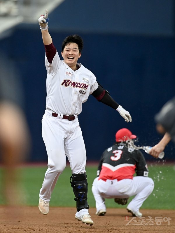 24일 서울 고척스카이돔에서 ‘2022 신한은행 MY CAR KBO리그’ KIA 타이거즈와 키움 히어로즈 경기가 열렸다. 9회말 2사 만루 키움 전병우가 끝내기 안타를 친 후 환호하고 있다.
