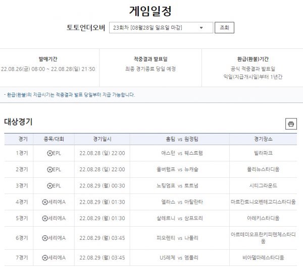 이번 23회차는 28일(일)부터 29일(월)까지 열리는 잉글랜드 프리미어리그(EPL) 3경기 및 이탈리아 세리에A 4경기를 대상으로 토토팬들을 찾아간다.