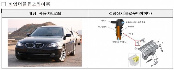 BMW코리아에서 수입·판매한 528i 등 29개 차종 1만8522대는 블로우바이히터(엔진 냉간 시 미연소 가스에 의한 퇴적물 등의 문제를 해결하기 위해 미연소 가스를 가열하여 흡기관으로 유입시키는 장치) 내 발열체와 구리관 사이 미세 공간으로 수분이 생성돼 과열되고, 이로 인해 플라스틱 코팅이 녹아 화재가 발생할 가능성이 확인돼 리콜에 들어간다.