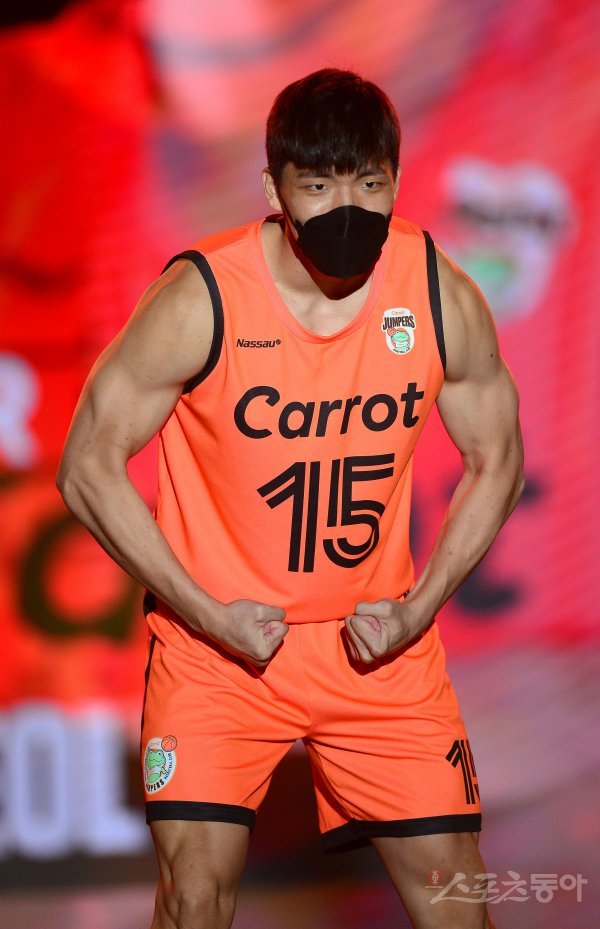 25일 고양체육관에서 열린 ‘고양 캐롯 점퍼스’ 프로농구단 창단식에서 박진철이 새 유니폼을 입고 소개되고 있다.