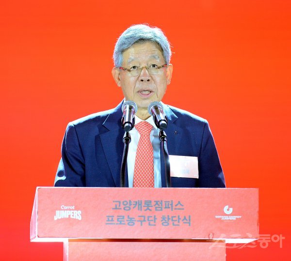 25일 고양체육관에서 열린 ‘고양 캐롯 점퍼스’ 창단식에서 김희옥 KBL총재가 축사를 있다.