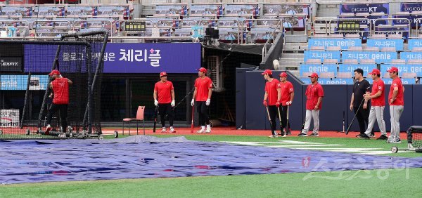 25일 경기도 수원 kt위즈파크에서 ‘2022 신한은행 SOL KBO리그’ kt 위즈와 SSG 랜더스의 경기가 열린다. 경기 전 SSG 선수들이 방수포가 덮힌 그라운드 옆에서 훈련을 하고 있다.