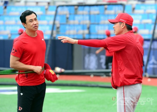 25일 경기도 수원 kt위즈파크에서 ‘2022 신한은행 SOL KBO리그’ kt 위즈와 SSG 랜더스의 경기가 열린다. 경기 전 SSG 김원형 감독이 김강민과 이야기를 나누고 있다.