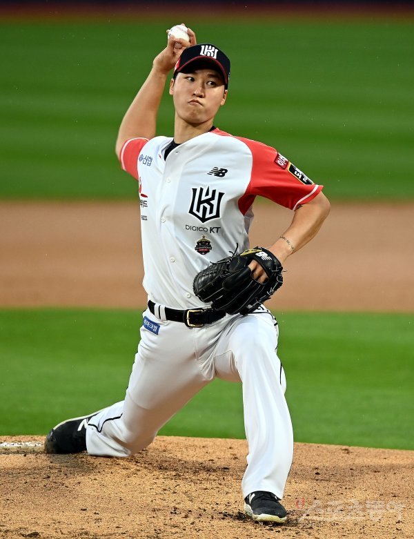 25일 경기도 수원 kt위즈파크에서 ‘2022 신한은행 SOL KBO리그’ kt 위즈와 SSG 랜더스의 경기가 열렸다. kt 선발투수 엄상백이 힘차게 볼을 던지고 있다.