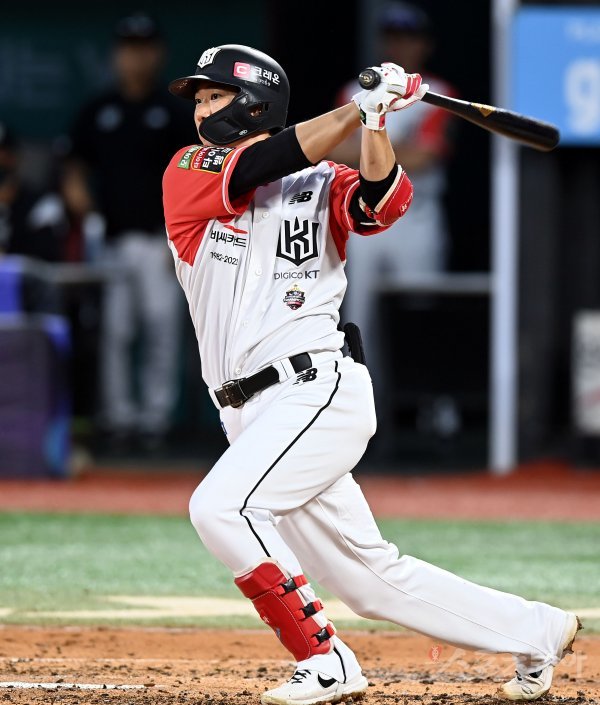 25일 경기도 수원 kt위즈파크에서 ‘2022 신한은행 SOL KBO리그’ kt 위즈와 SSG 랜더스의 경기가 열렸다. 2회말 1사 3루에서 kt 오윤석이 1타점 동점 적시타를 날리고 있다.
