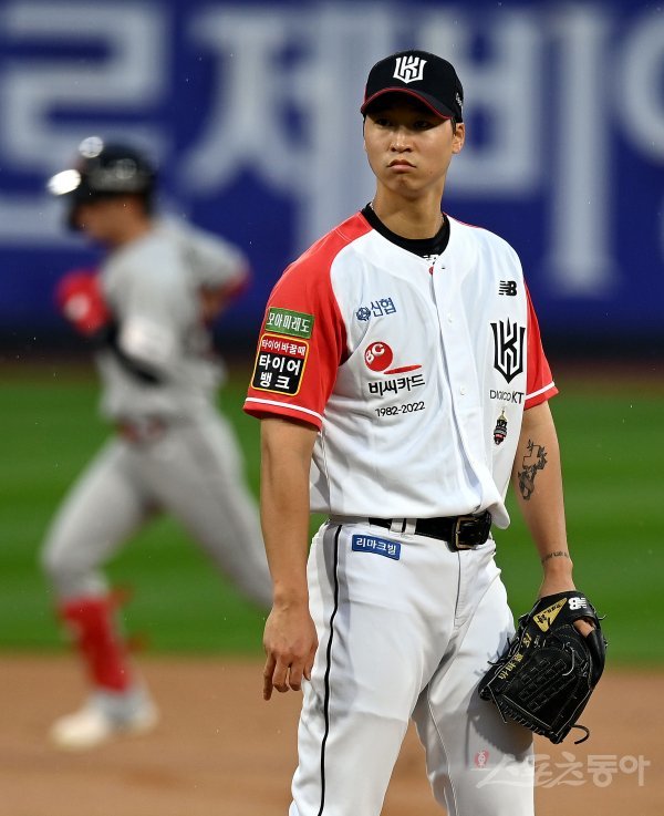 25일 경기도 수원 kt위즈파크에서 ‘2022 신한은행 SOL KBO리그’ kt 위즈와 SSG 랜더스의 경기가 열렸다. 1회초 1사에서 kt 선발 엄상백이 홈런을 허용한 후 아쉬워하고 있다.