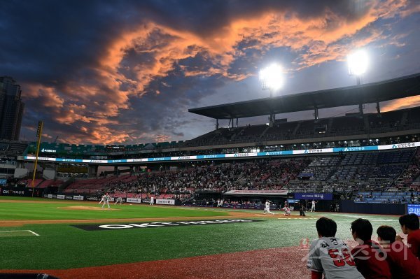 25일 경기도 수원 kt위즈파크에서 ‘2022 신한은행 SOL KBO리그’ kt 위즈와 SSG 랜더스의 경기가 열렸다. 비가 잠시 그치고 수원야구장에 저녁노을이 물들고 있다.