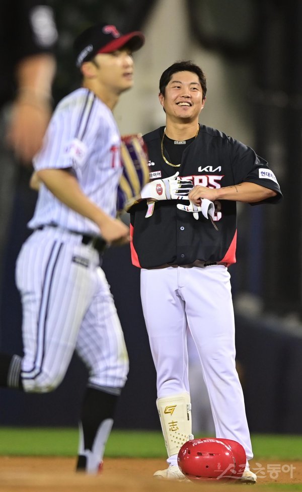 25일 서울 잠실야구장에서 열린 ‘2022 신한은행 SOL KBO리그’ LG 트윈스와 KIA 타이거즈의 경기에서 5회초 2사 KIA 류지혁이 안타성 타구가 LG 중견수에게 잡히자 허탈하게 웃고 있다.