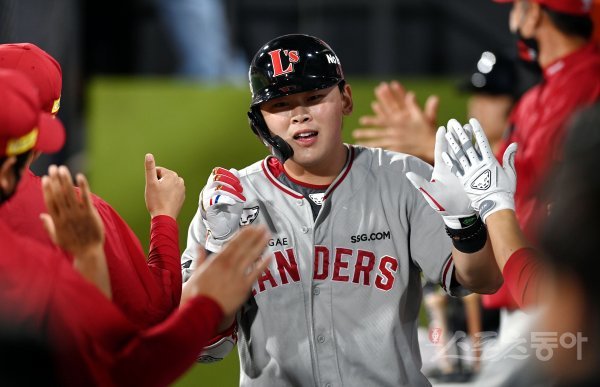 25일 경기도 수원 kt위즈파크에서 ‘2022 신한은행 SOL KBO리그’ kt 위즈와 SSG 랜더스의 경기가 열렸다. 6회초 2사 1루에서 SSG 전의산이 투런 홈런을 쏘아 올린 후 동료들의 환영을 받고 있다.